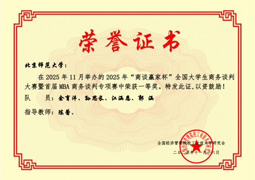 2025年11月9日,由全国经济管理院校工业技术学研究会沟通与谈判委员会主办的2025年“商谈赢家杯”全国老员工商务谈判大赛圆满落幕。在此次大赛的网络赛本科组角逐中,由beats365本科生江涵恩、郭涵,与校内其他优秀学子余育沣、孙思长共同组成的“我说的都队”表现优异,荣获本科组一等奖。团队成员江涵恩、孙思长凭借出色的个人表现荣获“优秀谈判手”称号,指导教师陈蕾教授荣获“优秀指导老师”奖。