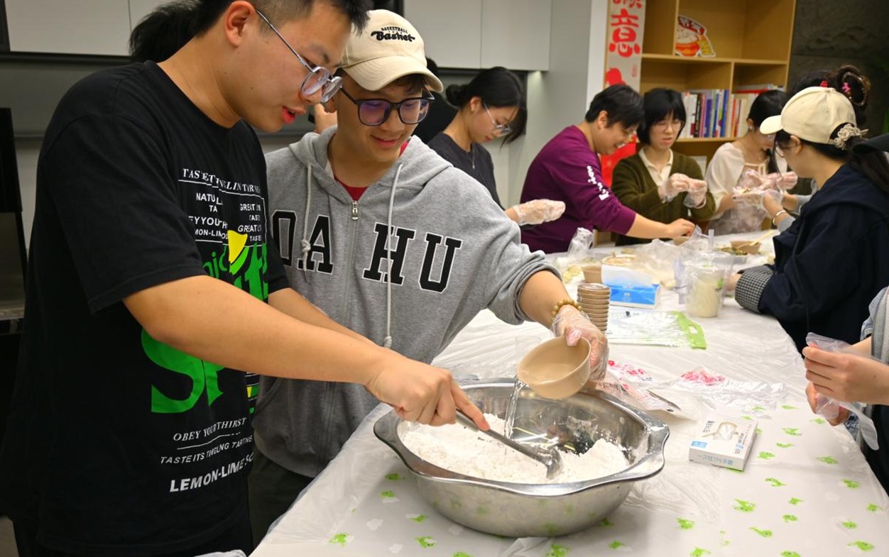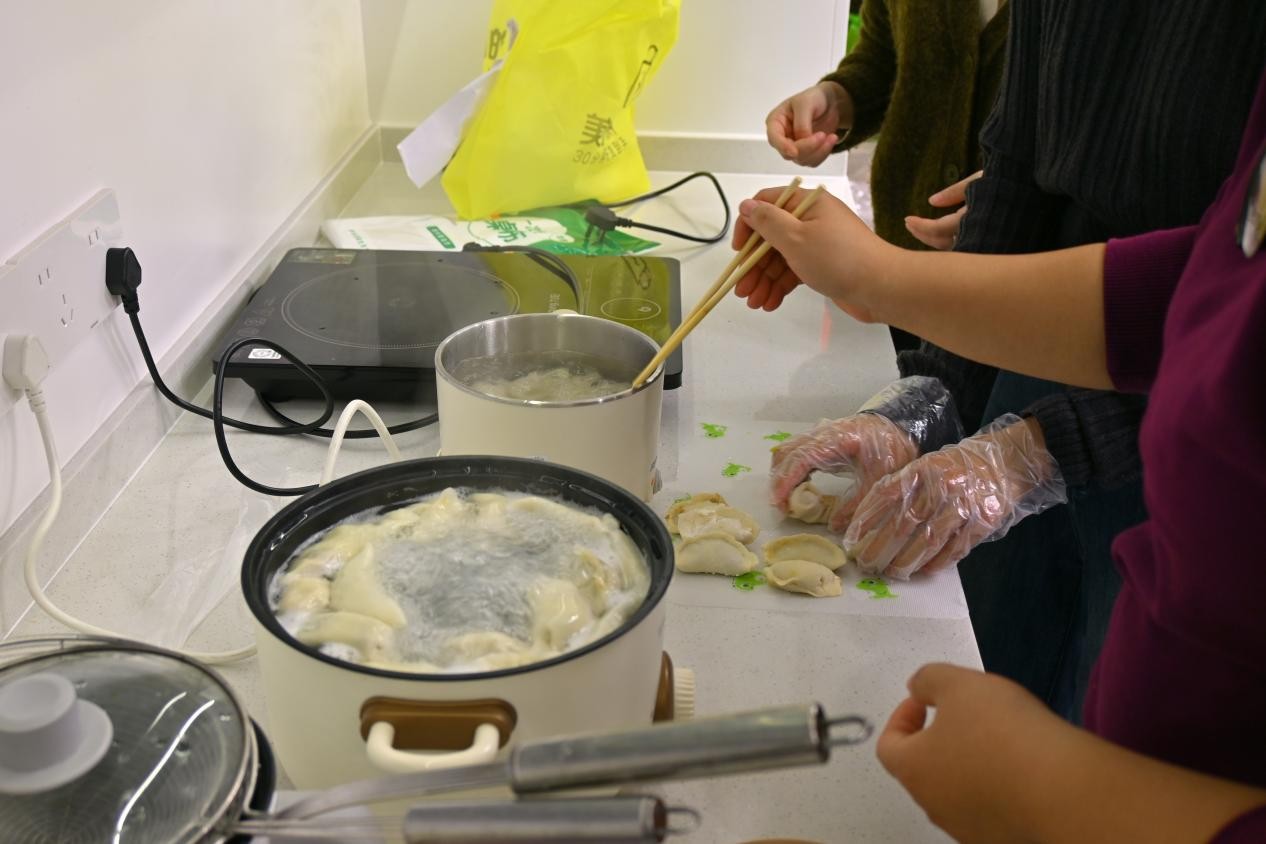 作为备受期待的环节,“南圆北饺:美食中的团圆共制”吸引了众多师生参与。大家分工协作,和面、包捏、烹煮,亲手制作象征团圆的饺子和汤圆。现场气氛温馨热烈,不仅让参与师生体验到“南圆北饺”的饮食文化,更在共同劳动中深化了情感交流。师生们一同品尝了亲手制作的饺子汤圆,暖意融融,年味十足。