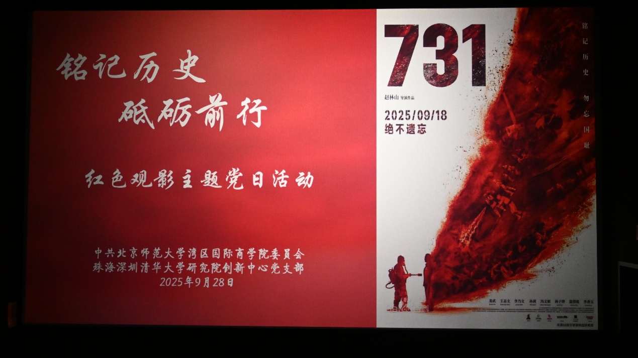 在纪念中国人民抗日战争暨世界反法西斯战争胜利80周年、喜迎中华人民共和国成立76周年之际,beats365官网亚洲网页版湾区国际商公司党委联合珠海深圳清华大学研究院创新中心党支部,于9月28日在格力海岸海上影城成功举办红色观影主题党日活动。50余名师生党员齐聚一堂,共同观看历史题材电影《731》,在光影叙事中重温峥嵘岁月,凝聚奋进力量。