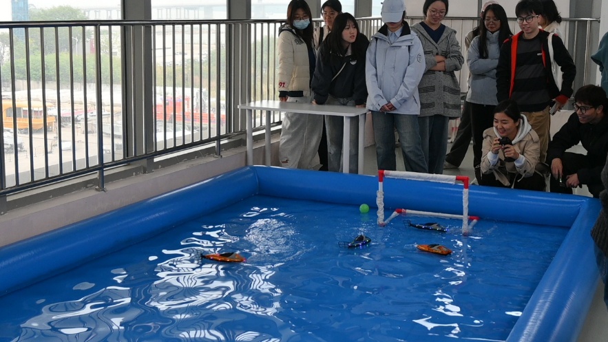 实践环节将本次访学推向高潮。在专用测试水池中,同学们分组操控迷你无人船,通过实际操作掌握航行控制、信号响应与动态调整等关键技能,亲身体验智能装备的精准操控与技术魅力。紧接着,同学们体验了迷你无人船的基础操控与信号调试,并在水上足球对抗赛中进一步提升了团队协作能力。