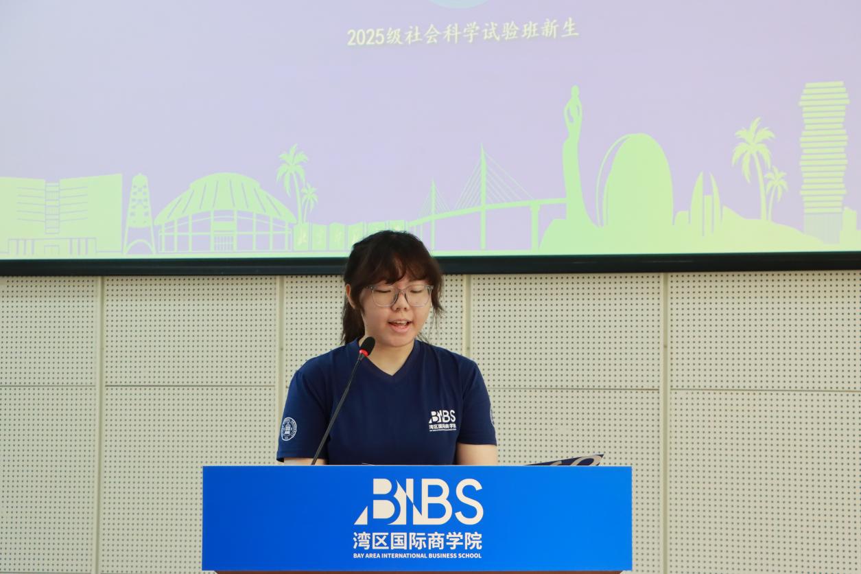 2025级社会科学试验班徐梓畅代表本科生新生发言,她讲述了自己与湾商的“双向选择”——百年学府的人文底蕴、粤港澳大湾区的创新活力,以及公司“重实践、有特色”的办学理念,让她坚定了求学选择。她提出“做带着思考扎根的学习者、瞄准需求探索的实践者、心怀家国担当的同行者”三点心愿与全体新生共勉,呼吁大家将个人成长融入时代发展,以扎实学识、务实行动和炽热担当书写湾商学子的精彩答卷。