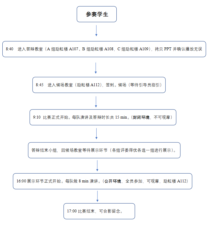 3. 参赛当天,请各队携带演示PPT(U盘)到现场演讲。每个团队答辩时间共为15分钟,其中团队陈述时间为8分钟;提问与回答时间为7分钟。所有参赛选手严格把控时间。(注意:请在赛前准备拷贝PPT环节,将演示文件拷贝到赛场电脑上。否则,拷贝PPT时间将从团队答辩时间中扣除,见参赛队伍流程)。